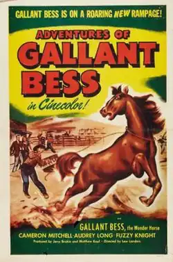 Adventures of Gallant Bess is a 1948 American contemporary western film directed by Lew Landers and starring Cameron Mitchell, Audrey Long, Fuzzy Knight, James Millican, and John Harmon. It was filmed in Cinecolor. It has no connection to the 1947 Metro-Goldwyn-Mayer film Gallant Bess,[3] though publicity stated that "Bess the Wonder Horse" from the earlier film was also in this film.[4]