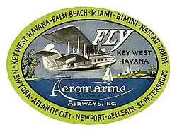 It was reorganized as Aeromarine Airways in spring of 1921 with Inglis Moore Uppercu, a New York City Cadillac dealer as its president. Aeromarine enjoyed many firsts - the first U.S. international air mail service and first scheduled U.S. international passenger service (Key West to Havana, November 1, 1920); first total-service U.S. airline (passenger, mail, express cargo); first in-flight movie (Chicago, August 1921); first airline baggage label (1921); and the first U.S. airline ticket office (Cleveland, July 1922).[5] Its slogan was "Speed Safety Comfort".[6] The overseas flights in Felixstowe F5L flying boats named the Nina, Pinta, and Santa Maria brought passengers to popular destinations that still allowed drinking at the start of Prohibition.[7] The new metal-hulled, six-passenger Aeromarine AMC was placed into service in 1924 but operated for only a short time before service ceased.[8]