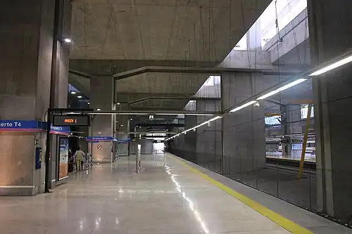 Aeropuerto T4 ([aeɾoˈpweɾto te ˈkwatɾo], "Airport Terminal 4") is a station on Line 8 of Madrid Metro and Lines C-1 of Cercanías Madrid on the lower level of the new terminal T4 of Madrid-Barajas Airport. The metro station was opened on 3 May 2007 and the commuter rail station was opened on 22 September 2011; and presents the particularity of requiring the payment of a special supplement of €1 for users of single ticket or Metrobus, the same way it happens in the station Airport T1-T2-T3. It is located in fare Zone A.[1]