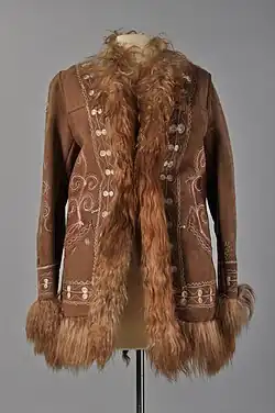 An Afghan coat is a sheepskin or goatskin coat made with the fleece on the inside and the soft suede-like leather on the outside. It is a development of the traditional overcoat of the Afghan people, which could be anywhere from jacket- to ankle-length, with full or partial sleeves.[1]