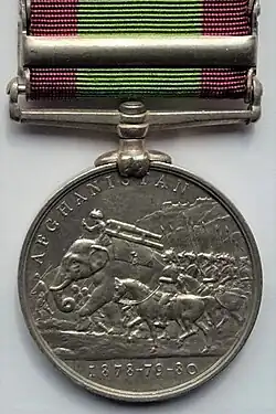 - The reverse shows marching and mounted soldiers with arms with an elephant carrying a cannon. In the upper-left of the medal around the edges is "AFGHANISTAN" and on the bottom in a straight line is "1878-79-80"
