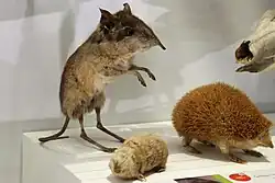 Taxidermied animals at the Cambridge University Museum of Zoology, England. On the left four-toed elephant shrew (Petrodromus tetradactylus), in the middle Cape golden mole (Chrysochloris asiatica) and on the right greater hedgehog tenrec (Setifer setosus). | |