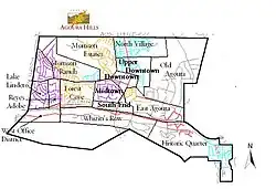 Agoura Hills (/əˈɡɔːrə ˈhɪlz/ ⓘ) is a city situated in the Santa Monica Mountains[9] region of Los Angeles County, California, United States. With a population of 20,330 as of the 2010 census,[8] which decreased to 20,299 in 2020.[10] Agoura Hills lies in the eastern Conejo Valley, nestled between the Simi Hills and the Santa Monica Mountains. Located 35 miles (56 km) northwest of Downtown Los Angeles and less than 10 miles (16 km) west of the Los Angeles city limits at Woodland Hills, Agoura Hills is bordered by Bell Canyon and Ventura County. Neighboring communities include Calabasas, Oak Park, and Westlake Village, while the unincorporated area of Agoura sits adjacent.