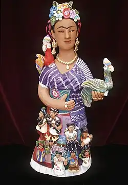 Born in 1956, Concepción Aguilar Alcántara learned how to work with clay from her father, Jesús.[2] Her mother died when she was eight years old. She sold her first piece at the age of twelve years old and continued her practice from there. She would go on to marry Jorge Sánchez Ruíz, who often collaborates with her when making art.[2] Like her father, she and Jorge have also taught their children the craft of clay-making. Concepción's favorite tools to work with, besides her hands, include the maguey and wedge.[2] She draws inspiration from many things, including silence itself. Motifs in her work include religious imagery, such as Noah's Ark, Day of the Dead festivities, elements of nature like cacti, and Frida Kahlo figures. She utilizes bright color in her work to depict such imagery.[2]