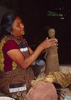 The Aguilar family are clay-making artisans from Ocotlán de Morelos, a rural town in the state of Oaxaca, Mexico. The town's clay production included only utilitarian items until Isaura Alcántara Díaz and her husband, Jesús Aguilar Revilla, expanded their wares into decorative figures and religious items.[1] The couple passed their craft down to their daughters Guillermina, Josefina, Irene, and Concepción, who have continued to innovate their own styles and techniques around subject matters related to the life and traditions in Oaxaca as well as iconic Mexican figures. The family craft and artistic recognition lives on through the children and grandchildren of these four women.