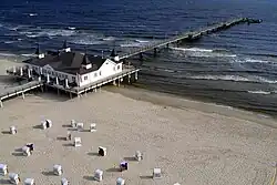 Major attractions include the famous 280 m (920 ft) long Seebrücke and the oldest preserved pier in Germany. Ahlbeck has numerous scenic houses and mansions in the German Gründerzeit style of resort architecture. The bathing resort OstseeTherme is a popular tourist attraction; close to it, there is the architecturally noteworthy Observation Tower Ahlbeck with three observation decks and an elevator.