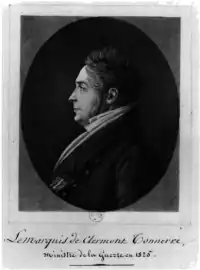 Clermont-Tonnerre sided with the moderate conservative party and was named Minister of the Navy and the Colonies in 1820 by Villèle.[1] In 1823, he became Minister of War and assiduously reorganized the army.