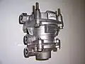 Relay valve(s) are used to improve brake response with long lines. Routing the lines for the rear and trailer service brakes through the brake pedal air valve could result in unacceptably slow actuation, so these brakes are plumbed directly to the service reservoir through a local relay valve (11) and the line from the brake pedal air valve is used to actuate the relay valve instead of the service brakes.[10] Similarly, quick-release valve(s) are located close to their respective brakes and allow the air to be exhausted more quickly when the brakes are released.[11]