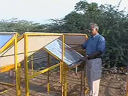 By the time they were ready for their first practical installation, they heard that one of their members, Girja Sharan, had obtained a grant to construct a dew condenser in Kothara, India. In April 2001, Sharan had incidentally noticed substantial condensation on the roof of a cottage at Toran Beach Resort in the arid coastal region of Kutch, where he was briefly staying. The following year, he investigated the phenomenon more closely and interviewed local people. Financed by the Gujarat Energy Development Agency and the World Bank, Sharan and his team went on to develop passive, radiative condensers for use in the arid coastal region of Kutch.[36] Active commercialisation began in 2006.[37]