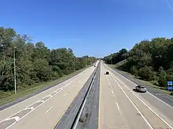 The Airport Connector begins at the entrance to Harrisburg International Airport in Lower Swatara Township, Dauphin County, where the roadway continues south to loop around the terminal. Past the airport, the road passes over Norfolk Southern's Royalton Branch and Amtrak's Keystone Corridor railroad lines before immediately reaching a partial cloverleaf interchange with PA 230. From this point, the four-lane freeway heads north-northeast through wooded areas adjacent to homes and farms, crossing over the Pennsylvania Turnpike (I-76) without an interchange as it curves north-northwest. The freeway passes more areas of farms and woods before it reaches its terminus at a trumpet interchange with the PA 283 freeway. The interchange also provides partial access between PA 283 and PA 441, but the Airport Connector has no connection to the latter route.[2]