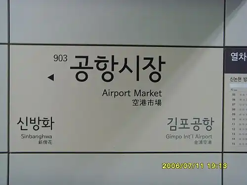 Airport Market station (Korean: 공항시장역; Hanja: 空港市場驛) is a subway station on Line 9 of the Seoul Metropolitan Subway, located in Gonghang-dong, Gangseo District, Seoul. The station's name is derived from the nearby Airport Market, located in Gonghang-dong, in connection with nearby Gimpo International Airport. However, the nearby Airport Market is small in scale.