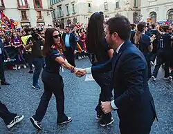 Her father is Valencian and had been part of the Catalan Countries independence party Movement for Defence of the Land,[4] and reportedly a member of the Catalan nationalist paramilitary group Terra Lliure;[19] he was among those arrested and, by their accounts, tortured ahead of the 1992 Summer Olympics as part of Operation Garzón. Acquitted in the resulting trial, Conca was part of the case that saw the Spanish state convicted in the European Court of Human Rights for violating the Convention Against Torture.[20][4] Due to her family's outspoken Marxist and Catalan independentist views, Bonmatí has been the subject of criticism from people of various alignments, including right-wing Spanish nationalists and socialist separatists.[21][20][22]