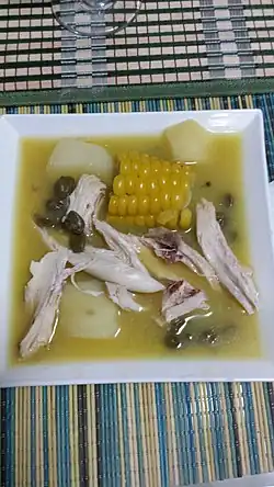 Ajiaco (Spanish pronunciation: [aˈxjako]) is a soup common to Colombia, Cuba,[1] and Peru.[2] Scholars have debated the origin of the dish. The dish is especially popular in the Colombian capital, Bogotá, being called ajiaco santafereño, where it is typically made with chicken, three varieties of potatoes, and the herb Galinsoga parviflora, known locally as guasca or guascas. In Cuba, ajiaco is prepared as a stew, while in Peru the dish is prepared with a number of regionally specific variations.