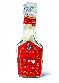 Ajinomoto Co., Inc. was created in 1908 as a subsidiary of Suzuki Pharmaceutical Co., Ltd., which was founded in May 1907 by Saburosuke Suzuki II and Kikunae Ikeda. Ajinomoto was created to let Ikeda, a professor at Tokyo Imperial University, sell monosodium glutamate (MSG) seasoning made from wheat that he invented and patented. He created the seasoning after discovering that MSG was the source of a flavor that he called umami. In April 1909, Ajinomoto presented Ikeda's seasoning under the brand name "AJI-NO-MOTO" at a new product exhibition event in Tokyo,[5] and began selling the product the next month.[6] Ajinomoto primarily marketed the seasoning to housewives by using their trademark, a housewife in an apron, in newspaper advertisements, on signboards, and on-ground stamps.[3][6]