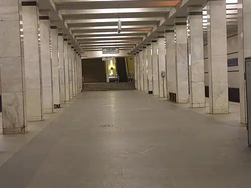 Akademicheskaya (Russian: Академи́ческая, IPA: [ɐkədʲɪˈmʲitɕɪskəjə], English: Academy's) is a station on the Moscow Metro's Kaluzhsko-Rizhskaya Line. It is named for the several Akademichesky Proyezd streets formerly located nearby, which were themselves named after the Russian Academy of Sciences but have all been renamed since. Akademicheskaya opened on October 13, 1962, and was designed by Yuliya Kolesnikova, Petukhova, and Fokina. Built to the relatively new pillar-trispan design (aka Sorokonozhka, centipede), which became prevalent in the 1960s due to its low construction costs. The station has white marble pillars accented with a stripe of black marble near the top. The walls, originally faced with white tile with four horizontal blue stripes, were re-covered in 2003 with similarly coloured aluminium planes for a cleaner, more modern look.