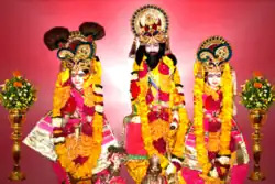 Akrura (Sanskrit: अक्रूर, romanized: Akrūra, lit. 'not cruel') is a Yadava prince in Hinduism, best known for being the uncle of the deity Krishna.[2] The son of Śvaphalka and Gandini, a daughter of the king of Kashi,[3] he is instructed by Kamsa to drive his nephews, Krishna and Balarama, to a Dhanuryāga (festival of arms) at Mathura, where they were to be slain.[4][5] He bears witness to the vishvarupa (theophany) of Krishna during this journey. Akrura becomes the owner of the Syamantaka jewel after the death of its previous owner, Satrajit. He is slain during the internecine Yadu massacre at Prabhasa.[6]