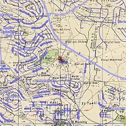 Al-Burj was occupied by the Israeli Army on July 15, 1948, during the second phase of Operation Dani. The Arab Legion counterattacked the following day with two infantry platoons and ten armoured cars but were forced to retreat. According to the Haganah 30 Arabs were killed and four armoured vehicles captured with 3 Israelis killed. Aref al-Aref records around 13 Legionaires killed.[4][5] Two elderly women and men remained. On the 23 July, one, a military cook, was sent out to pick vegetables. In his absence the other three were led to a house which, when an antitank shell missed, was blown up with six grenades. Two died: the surviving woman was then executed, and their bodies torched. The cook, on returning, didn't believe the story that they had been sent to a hospital in Ramallah, and some time later was executed with four bullets.[23] In 1992 the village site was described: "Only one crumbled house remains on the hilltop. Cactuses and wild plants grow on the site. The nearby settlements uses the village for hothouse agriculture."[24]