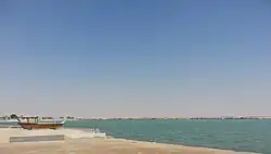 Al Khor overlooks a sheltered bay upon which Al Khor Island (also known as Purple Island and Jazirat Bin Ghanim) lies. The width of the bay ranges from 2.2 to 6.5 km (1.4 to 4.0 mi). It is linked to the open sea by a channel with a width of roughly 750 meters (2,460 ft) on its southern end.[27] The area is home to extensive stands of mangroves, which cover an area of about 168 hectares off the coast.[28]