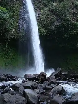A seminal event in Alajuela's history was the 1968 eruption of Volcán Arenal.[13] Residents previously referred to it as Mount Arenal. In the years before the eruption, residents reported rises in groundwater temperature and slight tremors. Beginning on 28 July 1969, residents of surrounding towns reported constant tremors.[14] The eruptions began on 29 July, spewing ash into the neighboring provinces and launching boulders into the sky.[13] The initial explosions were so strong that three craters were instantaneously created.[14] The cities of Tabacón, Pueblo Nuevo, and San Luís were buried, killing 87 people.[13] Crops were destroyed, and livestock killed.[13]