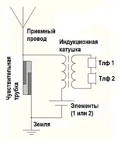 ![]() Schematic diagram of A.S. Popov's telephone receiver of dispatches with output transformer | |