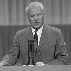 By 1970, Gore was considered to be fairly vulnerable for a three-term incumbent Senator, as a result of his liberal positions on many issues such as the Vietnam War (which he opposed)[24] and civil rights. This was especially risky, electorally, as at the time the Republican Party was becoming more competitive in Tennessee. He faced a spirited primary challenge, predominantly from former Nashville news anchor Hudley Crockett, who used his broadcasting skills to considerable advantage and generally attempted to run to Gore's right. Gore fended off this primary challenge, but he was ultimately unseated in the 1970 general election by Republican congressman Bill Brock. Gore was one of the key targets in the Nixon/Agnew "Southern strategy." He had earned Nixon's ire the year before when he criticized the administration's "do-nothing" policy toward inflation. In a memo[25] to senior advisor Bryce Harlow, Nixon aide Alexander Butterfield relayed the President's desire that Gore be "blistered" for his comment.[26] Spiro T. Agnew traveled to Tennessee in 1970 to mock Gore as the "Southern regional chairman of the Eastern Liberal Establishment". Other prominent issues in the race included Gore's vote against Everett Dirksen's amendment on prayer in public schools, and his opposition to appointing Clement Haynsworth and G. Harrold Carswell to the U.S. Supreme Court. Brock won the election by a 51% to 47% margin.