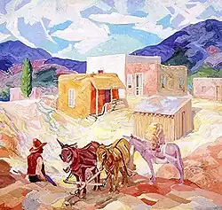 Krehbiel had associations and exhibitions with the other artists of the Santa Fe Art Colony—and the Taos Society of Artists—such as George Bellows and Gustave Baumann (exhibition in McPherson, Kansas, 1918), and Bror Julius Olsson Nordfeldt, Marsden Hartley, and Sheldon Parsons (exhibition in El Paso, Texas, 1920).[20][21] Other notable artists that Krehbiel exhibited with during this period include William Victor Higgins, Ernest L. Blumenschein, John French Sloan, Raymond Jonson, and Stuart Davis.[5][17]