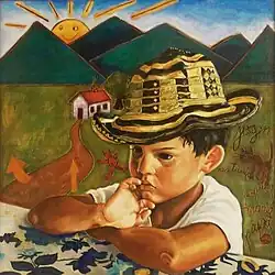 Gomez Gomez's first exhibition took place in 1979 at Casacoima in Guanare, capital of Portuguesa State in Venezuela in a group show along with other artists from the region. From 1975 to 1981, Gomez Gomez found work in Bogotá and in Venezuela as a freelance designer, typographer, illustrator and graphic artist for various small producers of wine, perfume, fashion products and the like, eventually working to produce massive photo-litho images. It was in this period that Gomez Gomez became interested in pursuing work in large murals. His first one-man show was held in 1981 at the Ateneo Popular in Guanare, Venezuela.[11] Gomez Gomez's first prominent mural was Caldas Tutelar, commissioned by the Consejo Superior (board of directors) of the Universidad Distrital of Bogotá, painted in 1987 (subsequently restored by the artist in 2013).[9] In 1981, Gomez Gomez returned to Bogotá where he accepted positions as Professor of Art History and fine art drawing for CIDCA (a regional college in Bogotá) for twelve years. Concurrently, he conducted classes and workshops at Universidad Pedagógica Nacional de Colombia in advanced color theory, textural representations in painting, anatomy and painting technique.[8] He subsequently spent most of 1996 at the Archivo General de la Nación (The National Archive of Colombia) in Bogotá, conducting research on the History of Art in Colombia. For the past few decades, he has lived between Orlando and Daytona Beach, in a largely rural section of Deltona, Florida. He has had exhibits in major cities worldwide. In March 2002, he concurrently presented his portrait of Florida's First Lady, Columba Bush; he was named Artist of the Month by The Orlando Museum of Art; and he was selected to receive the Simon Bolivar Prize as "Central Florida's Best Latin American Artist."[12]