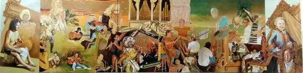 Gomez Gomez's work often typifies self-contradictory reference to the key subject matter; for example, the father referred to in a title may appear in the painting as a baby boy while his children are painted as elderly and doddering, or an otherwise sober and traditional old world square in a Latin American city may feature a gigantic iguana painted in a shallow depth of field, poised to leap off the canvas directly at the viewer. In his mural Sounds, Cuban Salsa legend Celia Cruz is accompanied by an anonymous bare-chested man drumming on a plastic bucket suggesting, in the words of El Nuevo Herald's Adriana Herrera, a "concert which would imply an impossible musical fusion, joining Beethoven's Ninth Symphony with Azúcar de la Guarachera of Cuba". This is a concert that Herrera calls a "riot of joy" which impossibly includes Louis Armstrong and Beethoven who seems to be listening intently to Pavarotti and Ray Charles.[15]