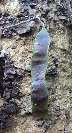 Albizia chinensis is a deciduous or evergreen tree that reaches a height of up to 30–43 m. Its trunk has a diameter up to 1–2 m. Its flowers are stalked heads that aggregate into a yellow panicle. The fruits are indehiscent pods.[2]