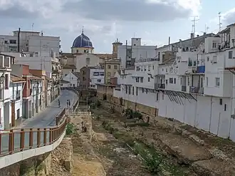 The basin discharges into the Albufera through a network of ravines or wadis.[10] The most significant ones are: The Rambla del Poyo (also known as the Torrente ravine, the Massanassa ravine, or the Chiva ravine), with a basin area of 367.6 km2, constitutes approximately 40% of the total basin area; the Barranco de Picasent (also known as the Beniparrell ravine) has a basin area of 23 km2; and the Barranc dels Algadins has a basin area of 23 km2, with the majority of its basin located in the municipality of Alginet, although it also traverses the municipality of Algemesí. In the municipality of Algemesí, the course of the ravine becomes indistinct, and it assumes the characteristics of an acequia, which drains into the Albufera.
