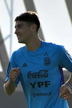 In May 2023, he was included in the Argentine squad that took part in the 2023 FIFA U-20 World Cup tournament, hosted by Argentina.[25] On 20 May he scored his first goal of the competition in the 2–1 victory over Uzbekistan.[26] Three days later he scored again, this time in a 3–0 win against Guatemala.[27]