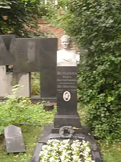 The real causes of Shcherbakov's death were obesity and excessive drinking. The writer Aleksandr Solzhenitsyn knew Shcherbakov's former chauffeur, from whom he learnt that "the obese Shcherbakov hated to see people around when he arrived at his Informburo, so they temporarily removed all those who were working in the offices he had to walk through. Grunting because of his fat, he would lean down and pull up a corner of the carpet. The whole Informburo caught it if he found any dust there."[7] Nikita Khrushchev, who had a very negative attitude towards him and considered Shcherbakov to be "a poisonous snake" and "one of the most contemptible characters around Stalin" wrote that "Shcherbakov ended up drinking himself to death – and he drank not so much because he had a craving for alcohol, but simply because it pleased Stalin when people around him drank themselves under the table."[8] According to historian Natalia Borisova “he (Shcherbakov) enjoyed enormous authority in Moscow. He was respected, even revered, listening to every word. Many later remembered him as a most noble man, a spiritual aristocrat, an exceptional personality”.[9]