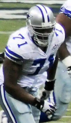 In 2010, he was acquired to provide depth and compete with Doug Free for the left tackle position, after the release of Flozell Adams.[8] He got off to an inauspicious beginning, in his first game and start at right tackle in place of an injured Marc Colombo, the Cowboys appeared to have come back from a 13–7 deficit on a touchdown pass from Tony Romo to Roy Williams on the final play against the Washington Redskins on the season opener.[9] However, Barron was flagged for holding defensive end Brian Orakpo and because the penalty was called against the offense, the game was over with the Cowboys losing.[10] Although he was active for 10 additional games, he would not play another down and was not re-signed at the end of the year.