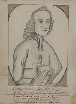 Hamilton also founded The Tuesday Club in 1745. This Annapolis-based social club included prominent men of the colonial Maryland community as both members and guests. Hamilton wrote a humorous account of the club's history in 1755, in which he gave its members comical pseudonyms and included caricatures and illustrations of memorable events; Hamilton even christened himself as Loquacious Scribble.[7] Called The History of the Ancient and Honorable Tuesday Club: From the Earliest Ages Down to This Present Year, it was not published during Hamilton's lifetime. The original manuscript is housed at the John Work Garrett Library of the Johns Hopkins University.