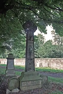 His 16 feet (4.87m) tall red sandstone cross stands close to the old East Gate (now sealed) of Warriston Cemetery (access is by another gate).