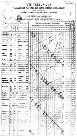 - ^ M. Beguyer de Chancourtois (1862). "Mémoire sur un classement naturel des corps simples ou radicaux appelé vis tellurique 54, 757–761". Comptes rendus. Archived from the original on 23 August 2009. Retrieved 21 January 2008.