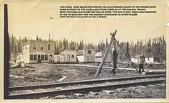 The fertile land favoured ranching in the area,[143] but one settler left farming for mining, when his chickens unearthed a gold nugget.[161] Trapper Matt Hilton (c.1876–1921),[162] who had a cabin about four miles (6.4 km) to the south, succumbed to his poor health and perished outdoors in the extreme winter cold.[163][164] Resident trapper F. Martin (Deafy) Dayton (1886–1940), formerly at Kidd,[165] promoted his big game hunting guide,[166] before returning to Kidd. Prior to Ole Hansen's (1892–1974) move to Hansard, he spent the 1920s at Aleza Lake.[167][168] Local trapper William Youst (1898–1951)[169][170] lived alone in north-central BC from the early 1920s.[171] The area was known for its moonshiners,[119][172] but during the 1930s, Youst's illegal still netted him a $100 fine or three months in jail.[173] Another permanent resident was farmer[174] and trapper John Miller, who operated a laundry during the early 1920s.[175][176] Trapper Johan (John) (Old Caribou) Bergstrom (1890–1969)[177][83] lived alone in a shack just west of the store, which children would frequent after school. At their urging, he would take them swimming or fishing. Parents were appreciative that he not only kept the youngsters safe, but also taught them to swim. When he returned from a winter of trapping, the children would rush to greet him.[178][179]