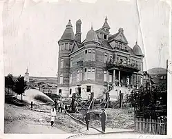 Clarke, who came to San Francisco from Ireland as a cabin boy in 1850,[1] had amassed a fortune of some $200,000 by dubious means while working for the police department from 1856 to 1887, for much of that time as clerk to the chief of police and later as the department's legal advisor.[4][5] He bought the lot in 1890 and completed the house in 1892 for a reputed $100,000.[1][3] Clarke engaged in an expensive legal feud with a neighbor over water sales,[4] and soon after completing the house lost his fortune in a nationwide economic depression; in 1892 he declared himself insolvent after signing his real estate holdings over to his wife and a friend in an attempt to conceal them. He then brought a series of unsuccessful lawsuits against the city and his creditors and was repeatedly jailed before dying at age 69. He lost the house in 1896 when he defaulted on the mortgage;[5] his wife had declined to live in the then largely rural area, preferring to remain on Nob Hill.[3][4]