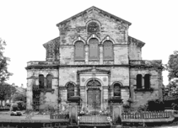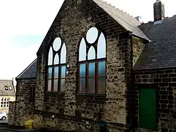This is a Grade II listed building.[32] Built on the corner of the A657 (Carr Road) and Chapel Street, Calverley, this "very handsome" chapel was completed in 1874 for $2,400,[nb 8] in the Italian style to replace a "very humble structure" built in 1840. It had a pediment with "projecting wings" on the front, and tiled floors inside. It had two front doors and two staircases, and at the back a one-storey school room, a kitchen and a vestry. It had a white-painted gallery with gilded mouldings, stained pitch pine pews and a platform-pulpit. The ceiling had a plain border, but "richly-moulded" centre-pieces to hang the chandeliers from, and the windows had stained-glass borders. It was paid for by subscription and bazaars.[33] According to Historic England, at the time of listing (1986) it still had its pews, gallery and ceiling bosses.[32]