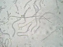 Macro- and microscopic photographs of Nostoc, the most common genus of cyanobacteria.[37]
