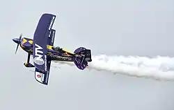 By 2003, in a quest for perfection to bring the highest performance in the sky over world's best air shows Öztürk has custom built the "Mor Menekşe" (Purple Violet), an awesome, single-seat aerobatic biplane of his own design.[23] With its extensively modified airframe and engine (407 hp),[30] Purple Violet is entirely in a class of its own.[23]