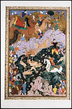 Only two extant paintings bear an attribution to Ali Asghar's own brush: the double-page frontispiece from a 1560s manuscript of Hatefi's Timurnameh, and "Iskandar building the iron rampart" from the 1576-7 Shahnameh of Shah Ismail II.[1] B.W. Robinson has also credited Ali Asghar with painting the two-page frontispiece of this manuscript, "Royal Hunt," based on the aforementioned Shahnameh illustration.