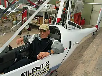 ![]() A Silent 2 Targa fuselage with a pilot trying out the cockpit | |