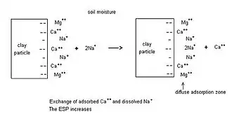 The presence of abundant Na+ ions in the soil solution and the precipitation of Ca2+ ions as a solid mineral causes the clay particles, which have negative electric charges along their surfaces, to adsorb more Na+ in the diffuse adsorption zone (DAZ, also more commonly called diffuse double layer (DDL), or electrical double layer (EDL), see the corresponding figure)[6] and, in exchange, release previously adsorbed Ca2+, by which their exchangeable sodium percentage (ESP) is increased as illustrated in the same figure.