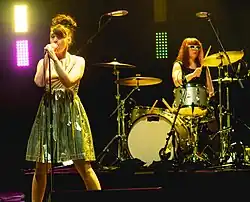With the resurgence of interest in pop-punk bands in the US in the early 1990s, along with the sunset strip "hair metal" scene becoming extremely crowded, bands who combined a "non-image" with loud raw music started were gigging at clubs like Rajis in Hollywood.[34] Bands such as Hole, Super Heroines, the Lovedolls, and L7 became popular, while demonstrating on stage, and in interviews, a self-confident "bad girl" attitude at times, always willing to challenge assumptions about how an all-female band should behave. Courtney Love described the other females in Hole as using a more "lunar viewpoint" in their roles as musicians.[35] In the 1990s, riot grrrl became the genre associated with bands such as Bratmobile and Bikini Kill. Other punk bands, such as Spitboy, have been less comfortable with the childhood-centered issues of much of the riot grrrl aesthetic, but nonetheless also have dealt explicitly with feminist and related issues.[36] All-female Queercore[37] bands, such as Fifth Column, Tribe 8, and Team Dresch, also write songs dealing with matters specific to women and their position in society.[38] A film put together by a San Diego psychiatrist, Dr. Lisa Rose Apramian, along with the former drummer from the Motels and the Droogs, Kyle C. Kyle,[39][40] the documentary Not Bad for a Girl explored some of these issues with interviews from many of the female musicians on the riot grrrl scene at the time.[41]