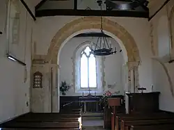 The chancel measures 14.5 by 20 feet (4.4 m × 6.1 m): these unusually short proportions are evidence of the work carried out in the 14th century to cut its length back.[14] It is lower than the nave, which has original Norman doorways in its north and south walls.[1] The latter is now blocked, and has a crude stone lintel with the remains of a segmental arch above. The doorway in the north wall survives in good condition, and is flat-arched with voussoirs and wedge-shaped springers.[14] Three original windows survive in the nave; all are placed very high on the walls.[11][19] The chancel's lancet windows, in contrast, were inserted in the 13th century or later.[11] Its larger east window is in the Decorated Gothic style and dates from the 14th century.[8]