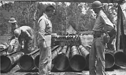 The first unit of the Second Australian Imperial Force (AIF) to arrive, the 2/3rd Light Anti-Aircraft Battery, disembarked on 11 April 1942, having returned to Australia from the Middle East just four weeks before. The US 101st Coast Artillery (Anti-Aircraft) Battalion followed on 5 May, and its commander, Lieutenant Colonel Joseph B. Fraser, took charge of Port Moresby's anti-aircraft defences.[31][32] Morris's command became New Guinea Force on 15 April.[33] By the end of June the ground forces in New Guinea consisted of 1,098 AIF, 12,273 Militia and 2,208 American troops.[34]