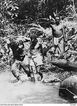 A carrier could carry about 13 days' worth of food, and traversing the track took eight days.[123] A carrier load was assessed at 18 kilograms (40 lb), but the water-logged wrapping caused it to weigh more. Since the carriers could not carry more, ANGAU had to take this into account when preparing the loads.[124] The initial movement of the 39th Infantry Battalion to Kokoda was supported by 600 carriers under Lieutenant H. T. (Bert) Kienzle from ANGAU. Along the track, Kienzle and Sergeant Major Maga of the Royal Papuan Constabulary established way stations, which they stocked with food gathered locally,[123] and were manned by ANGAU, who were responsible for both the carriers and the stores.[125][126]