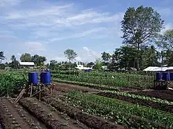 In 2003, the first allotment garden of the Philippines was established in Cagayan de Oro, Northern Mindanao as part of a European Union funded project.[25] Meanwhile, with the assistance of the German Embassy in Manila and several private donors from Germany, this number has grown to five self-sustaining gardens located in different urban areas of the city, enabling a total of 55 urban poor families the legal access to land for food production. Further four allotment gardens, two of them within the premises of public elementary schools are presently being set up for additional 36 families using the asset-based community development approach.[26] Some of the gardeners belong to the poorest in the city, the garbage pickers of the city's landfill site.[27] Aside from different vegetables, the gardeners grow also herbs and tropical fruits. In some gardens, small animals are kept and fish ponds are maintained to avail the gardeners of additional protein sources for the daily dietary needs. Each allotment garden has a compost heap where biodegradable wastes from the garden as well as from the neighboring households are converted into organic fertilizer, thus contributing to the integrated solid waste management programme of the city. Further, all gardens are equipped with so-called urine-diverting ecological sanitation toilets similar to practices in Danish allotment gardens described by Bregnhøj et al. (2003).[28]