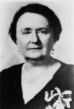 After the outbreak of World War I in 1914, she helped organise a group of over 400 French Canadian women with the goal of raising funds to help the Red Cross build a hospital ship to treat wounded soldiers.[3] The group also organised the production of clothing for soldiers on the front, especially those facing harsh winter conditions. After the group was successful, they decided to continue operating as the Fédération des femmes canadiennes-françaises, the first secular French-language women's organisation in Canada outside of Québec.[4] The Federation was headquartered in Ottawa.[5] Walker-Marchand was the Federation's chair for 32 years, until her death in 1946.[6]